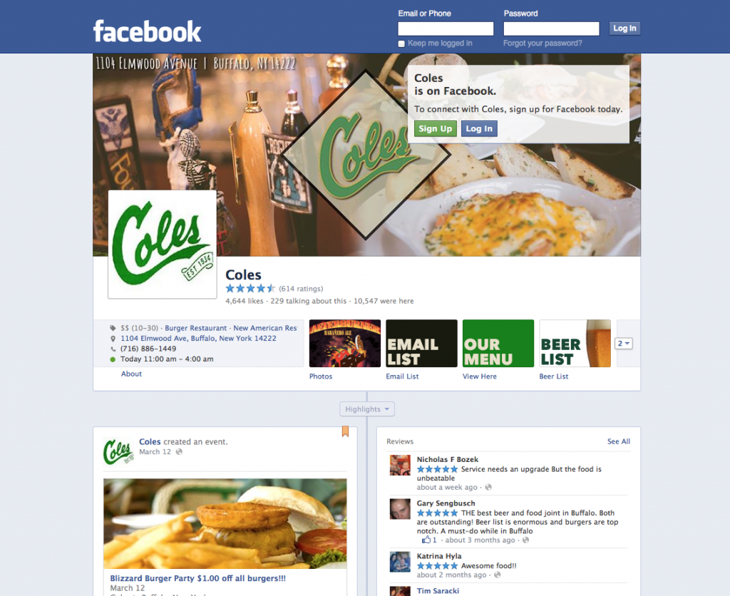 This is the old or current layout for a Facebook business page. You are probably fairly used to it by now, but as with many things, you might be getting a bit bored of it, since it’s pretty old now. Plus, it is a somewhat boring design in general. The posts and reviews are perfectly symmetrical and the contact info isn’t too exciting. Although, the apps are very easy to find, as they sit just under the cover photo at all times.